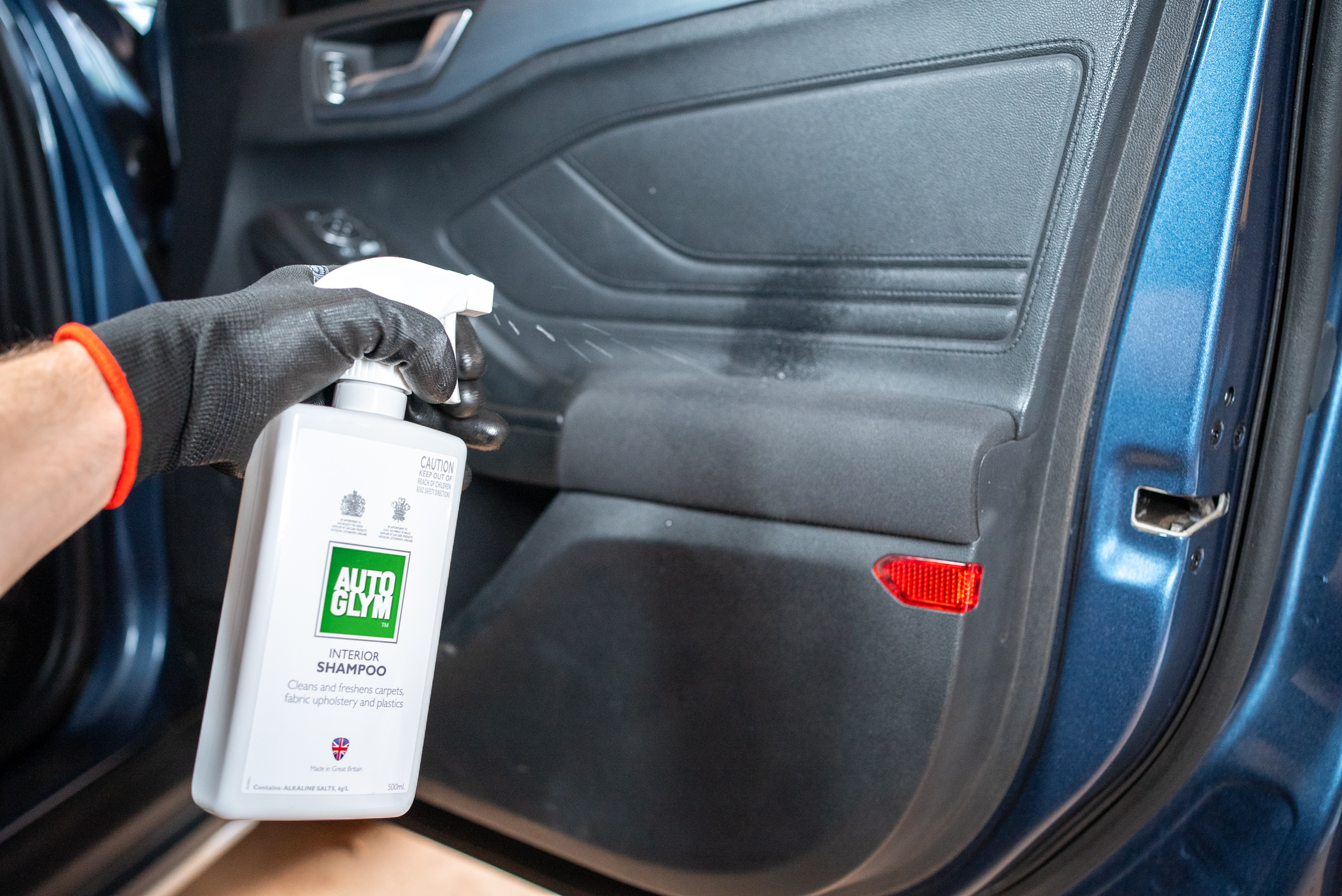 This starts with a simple vacuum and removal of any rubbish or items that don’t have a home in your car. Once all the loose dirt is gone, you can move onto embedded dirt and stains with a cleaning and protectant spray. Soak a new microfibre towel in this and wipe over any plastic or vinyl surfaces, using a bit of elbow grease to free up stains where necessary. Avoid using this on any control surfaces such as gear levers, steering wheel, handbrake and pedals. For tight and tricky areas, you can spray some on a detailing brush to get in deep.
