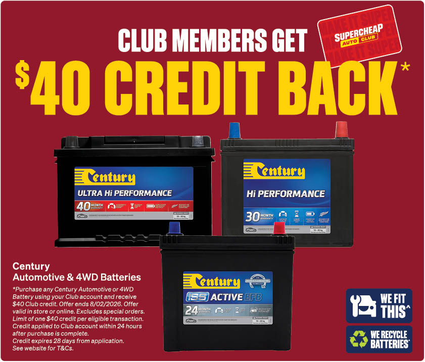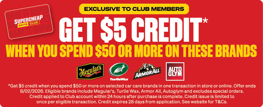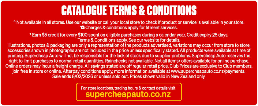 Illustrations, photos & packaging are only a representation of the products advertised, variations may occur from store to store, accessories shown in photographs are not included in the price unless specifically stated. All products were available at time of printing. Supercheap Auto will not be responsible for the lack of stock due to supplier problems. Supercheap Auto reserves the right to limit purchases to normal retail quantities. Not all items/offers available for online purchase. Online orders may incur a freight charge. All savings stated are off regular retail price. Club Prices are exclusive to Club members, join free in store or online. Afterpay & Zip conditions apply, more information available at www.supercheapauto.co.nz/payments. Sale ends 08/02/2026 or unless sold out. Prices shown valid in New Zealand only.
